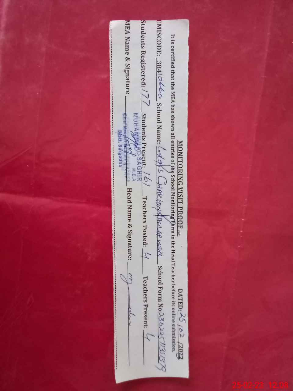 | Certified that this School was Inspected by the Undersigned MEA/DMO Today and the Information Stated Above is as Per Record. | |||||