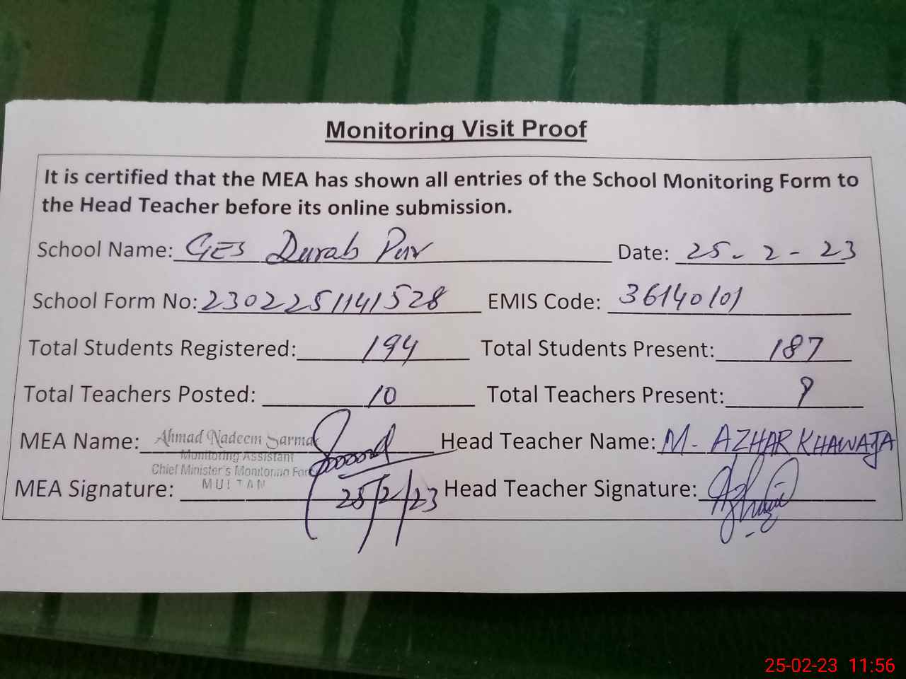| Attendance Register | Head Teacher | MEA with School | Visit Proof |
