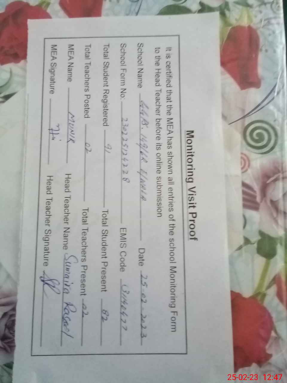 | Certified that this School was Inspected by the Undersigned MEA/DMO Today and the Information Stated Above is as Per Record. | |||||