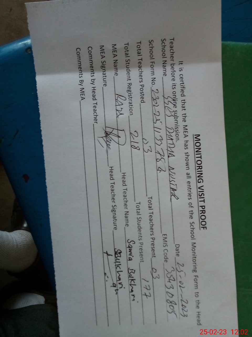 | Attendance Register | Head Teacher | MEA with School | Visit Proof |