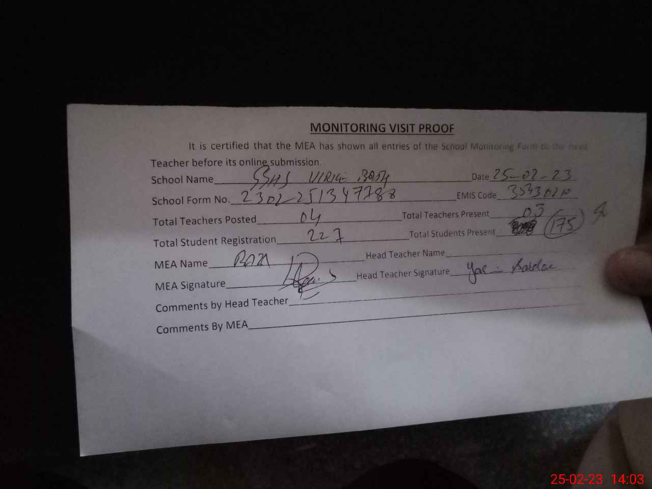 | Attendance Register | Head Teacher | MEA with School | Visit Proof |
