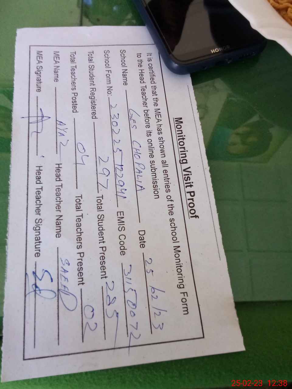 | Attendance Register | Head Teacher | MEA with School | Visit Proof |
