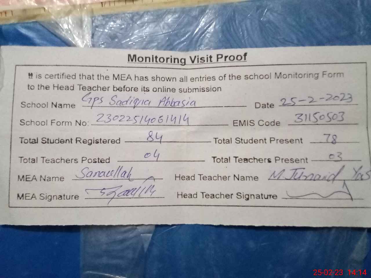 | Attendance Register | Head Teacher | MEA with School | Visit Proof |