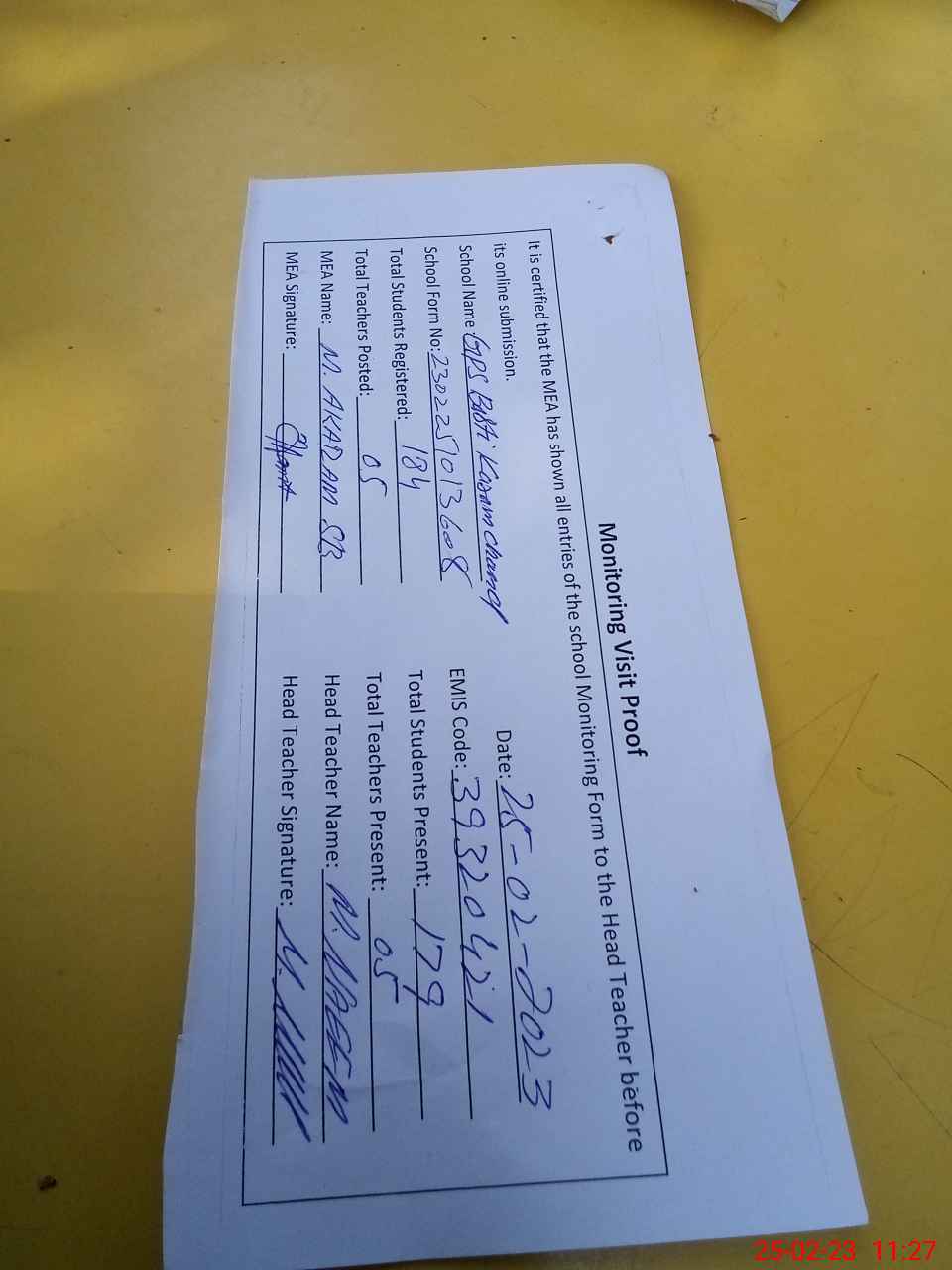| Attendance Register | Head Teacher | MEA with School | Visit Proof |