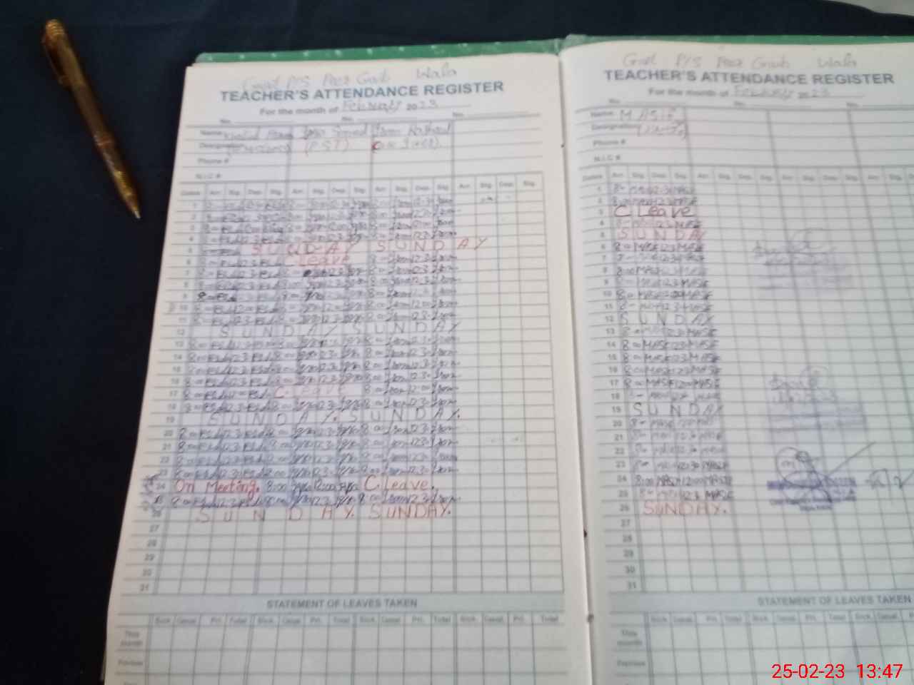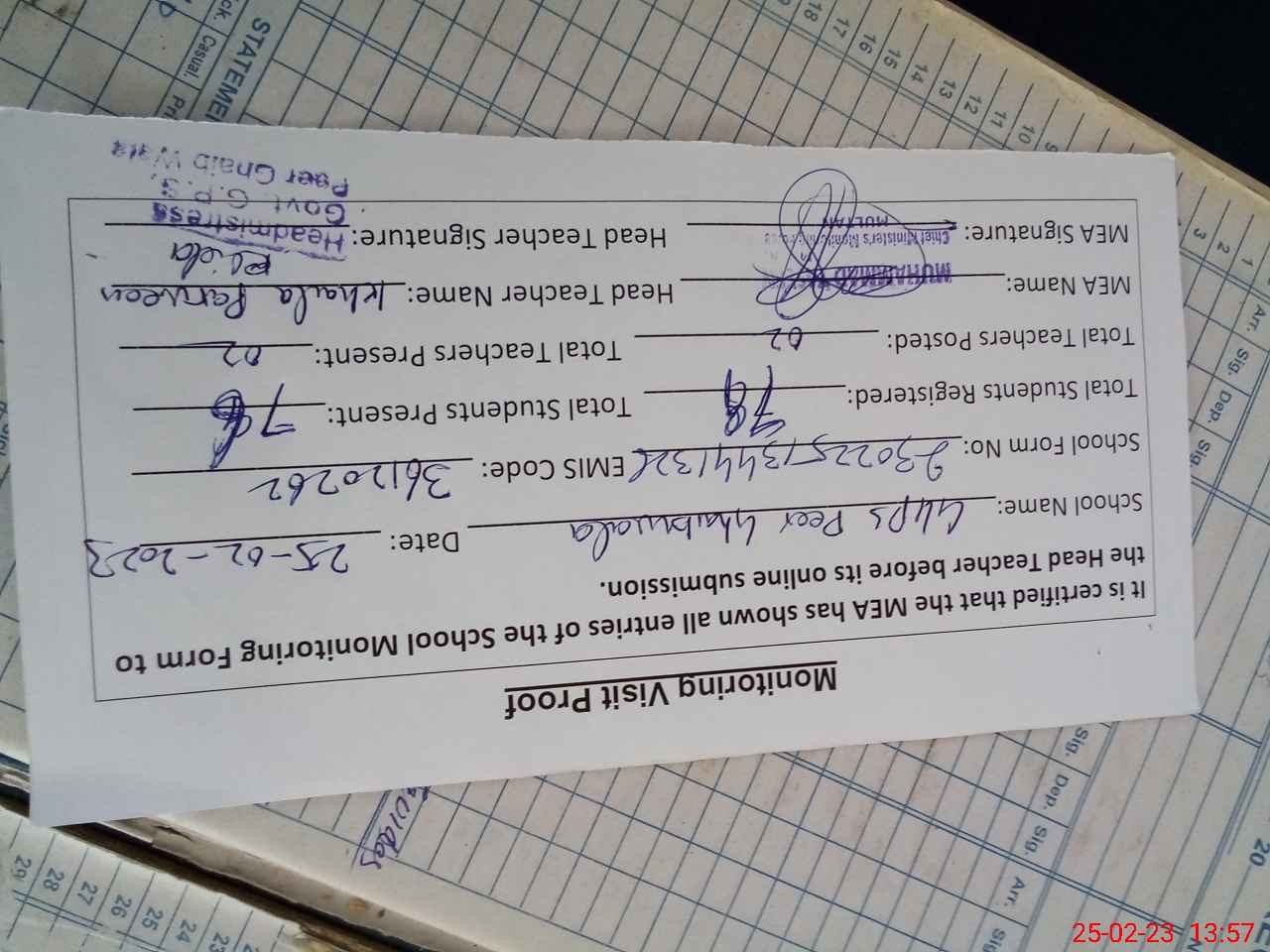 | Attendance Register | Head Teacher | MEA with School | Visit Proof |