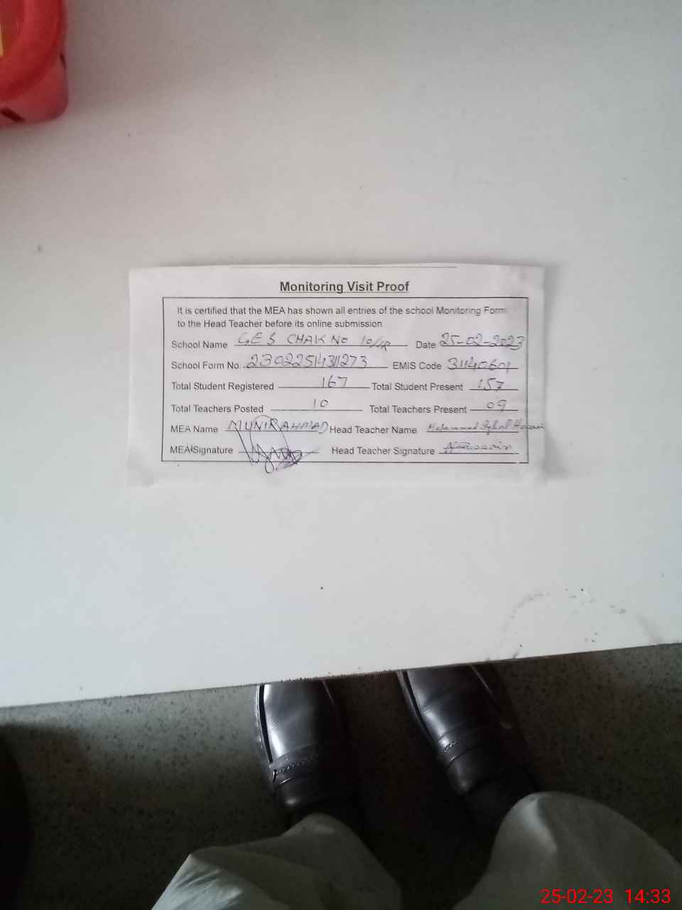 | Attendance Register | Head Teacher | MEA with School | Visit Proof |