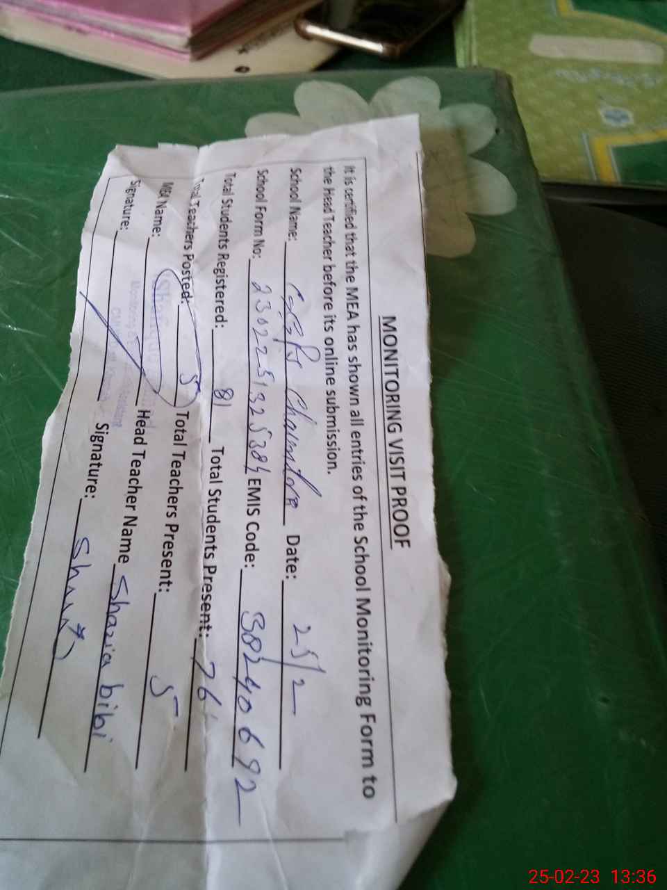 | Attendance Register | Head Teacher | MEA with School | Visit Proof |