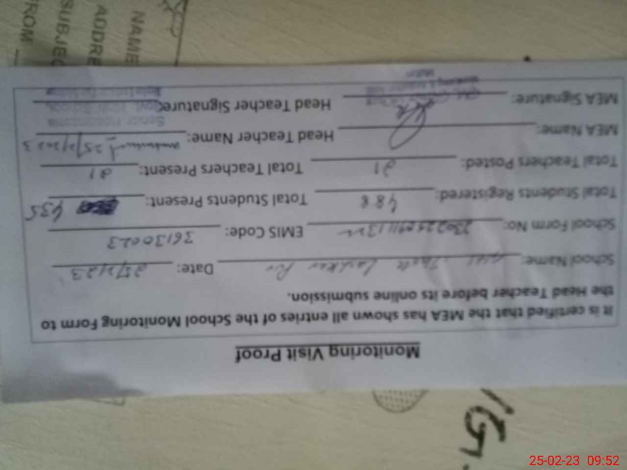 | Certified that this School was Inspected by the Undersigned MEA/DMO Today and the Information Stated Above is as Per Record. | |||||
