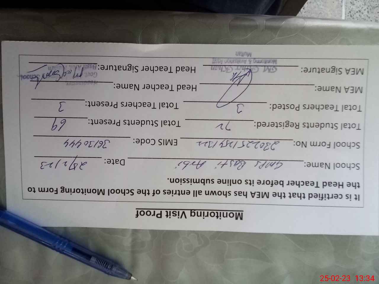 | Attendance Register | Head Teacher | MEA with School | Visit Proof |