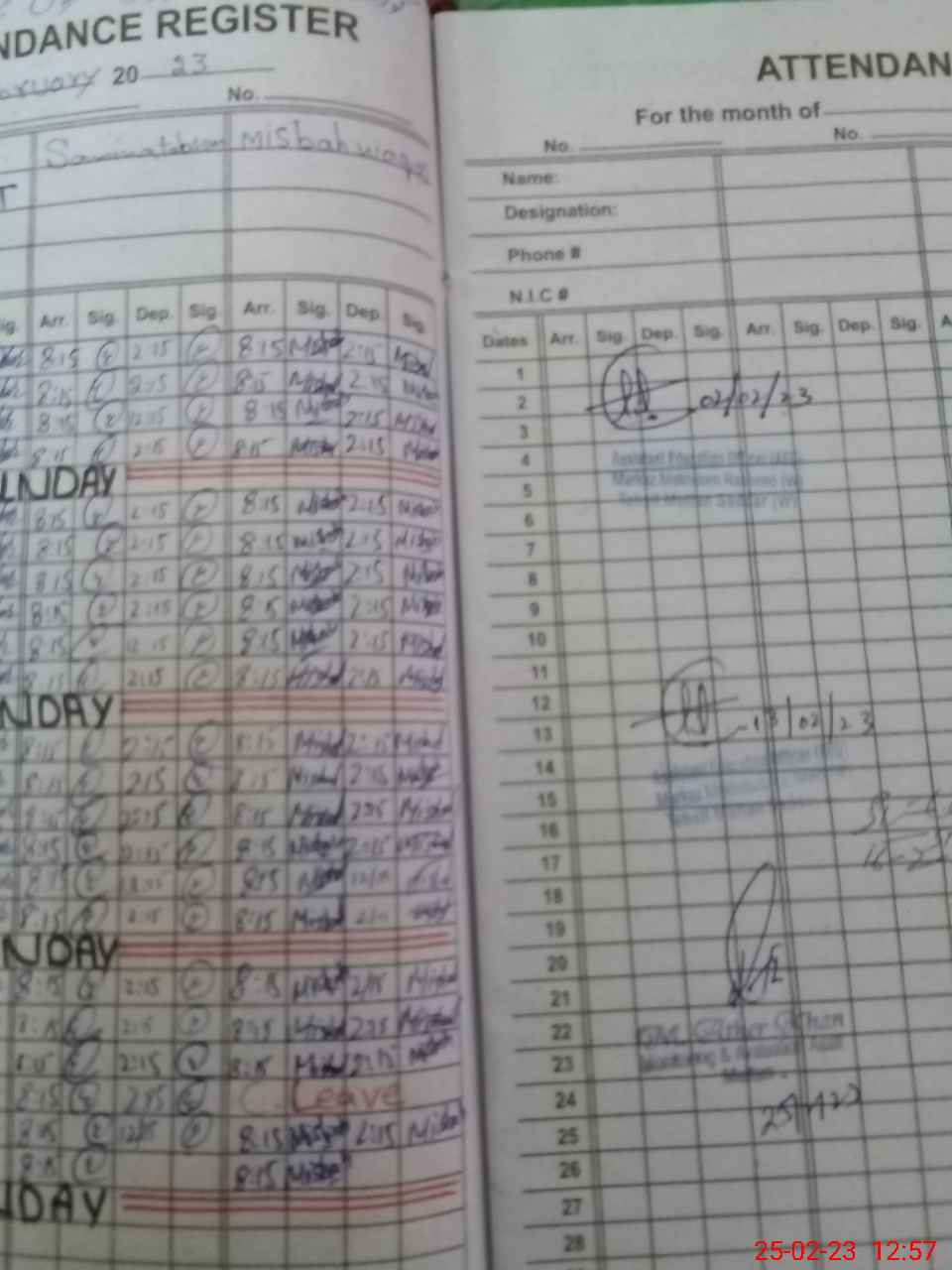 | CNIC | Full Name | Designation | R/C | Absence During Last Calender Month |