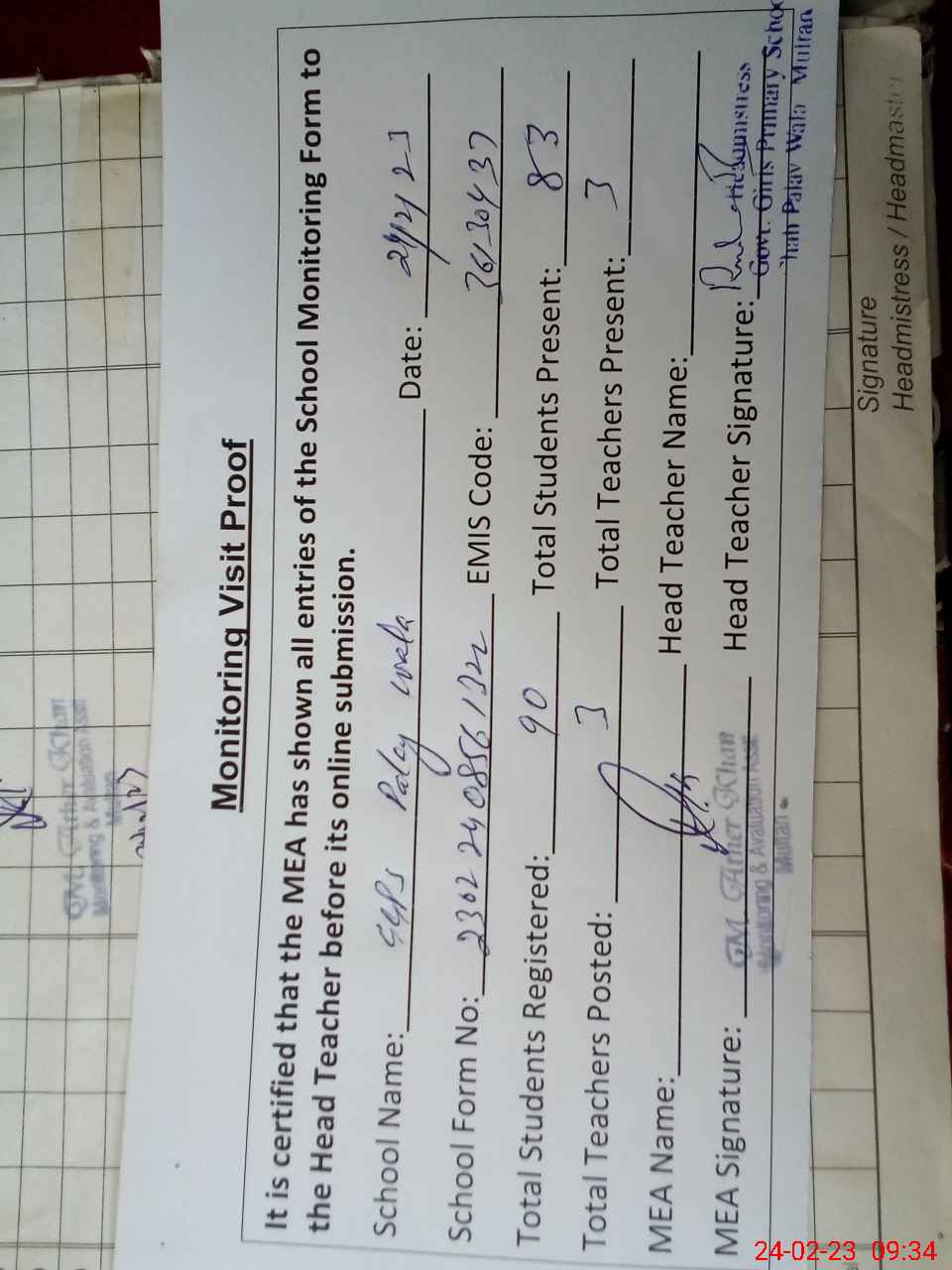 | Attendance Register | Head Teacher | MEA with School | Visit Proof |
