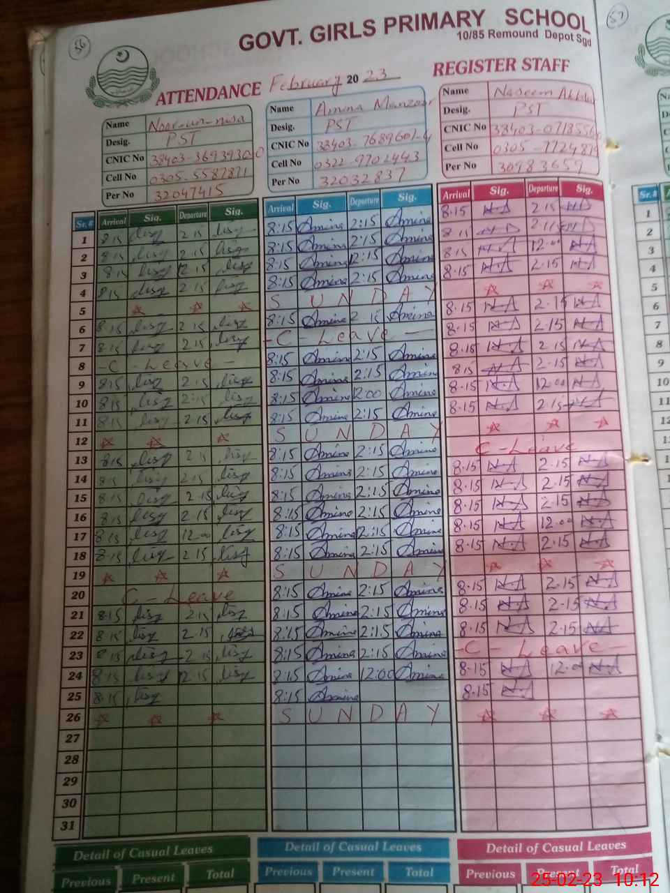 | CNIC | Full Name | Designation | R/C | Absence During Last Calender Month |