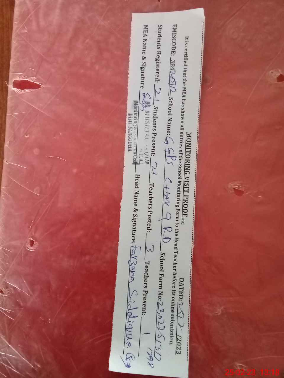 | Attendance Register | Head Teacher | MEA with School | Visit Proof |