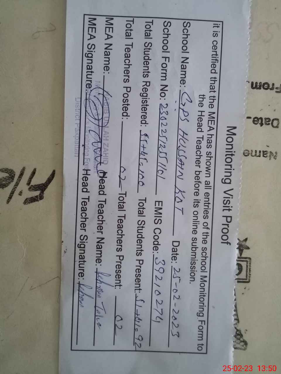 | Attendance Register | Head Teacher | MEA with School | Visit Proof |