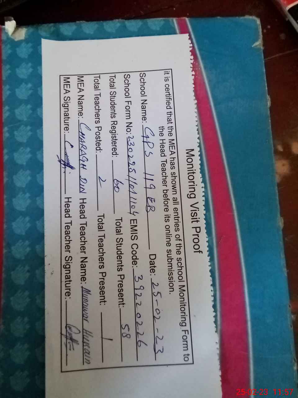 | Attendance Register | Head Teacher | MEA with School | Visit Proof |