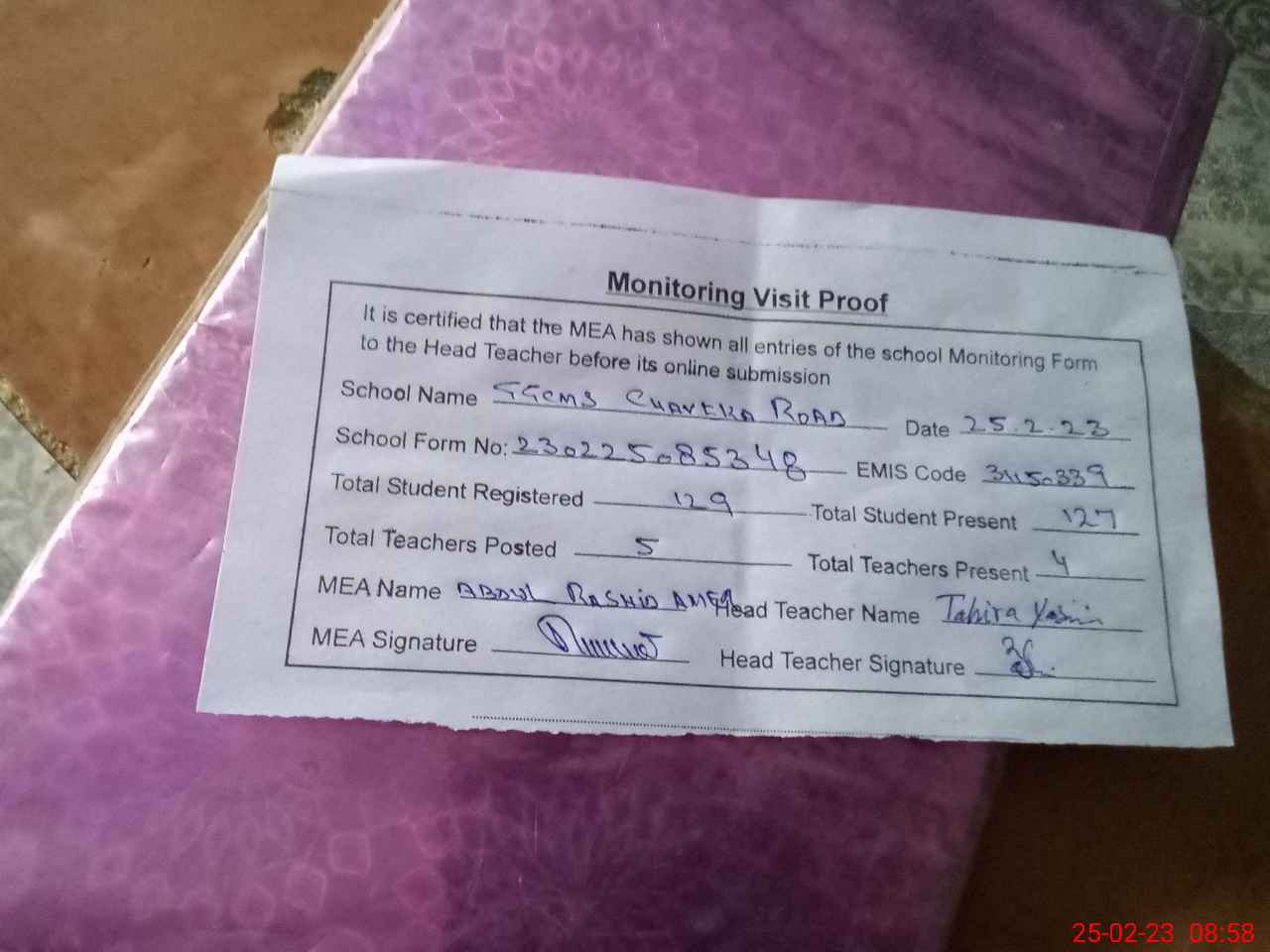 | Attendance Register | Head Teacher | MEA with School | Visit Proof |