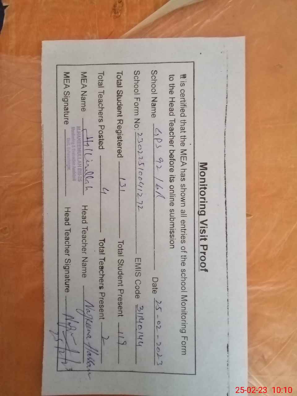 | Attendance Register | Head Teacher | MEA with School | Visit Proof |