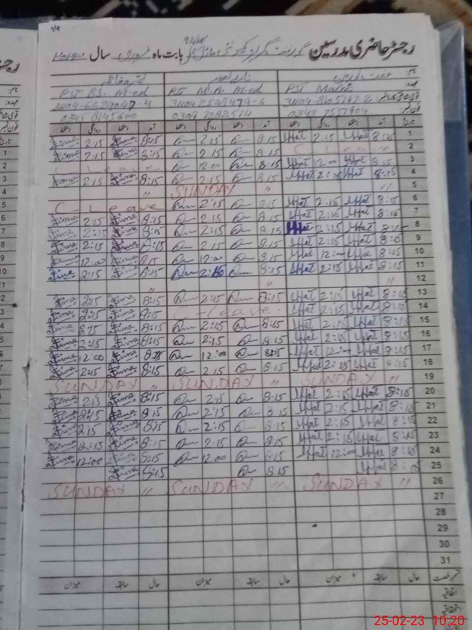 | CNIC | Full Name | Designation | R/C | Absence During Last Calender Month |
