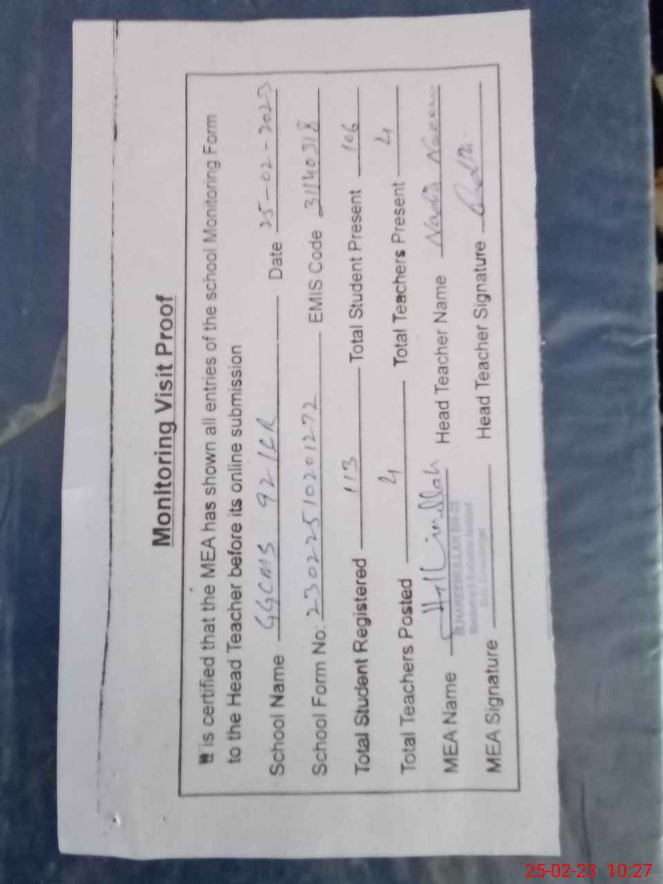 | Attendance Register | Head Teacher | MEA with School | Visit Proof |
