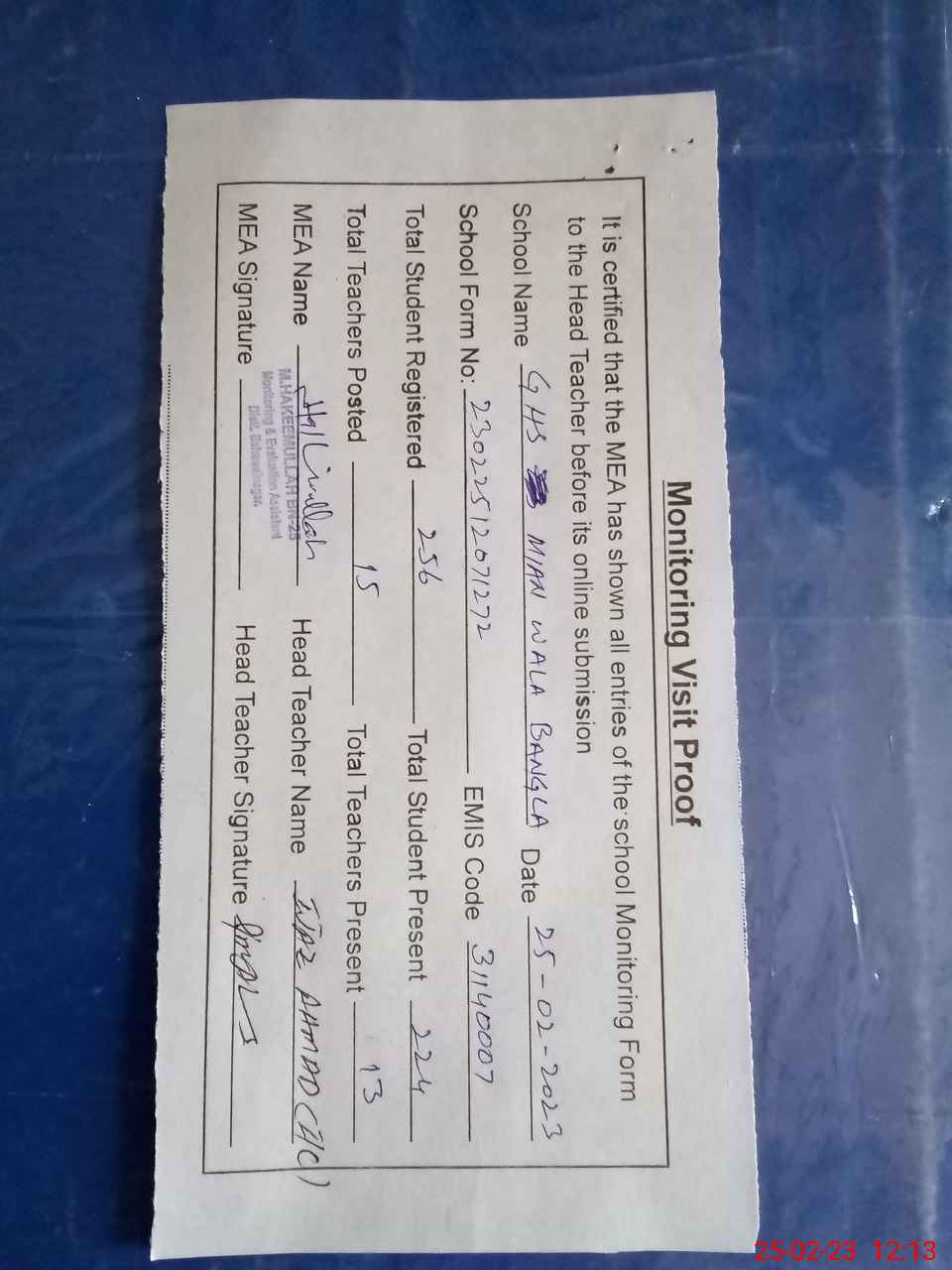| Attendance Register | Head Teacher | MEA with School | Visit Proof |
