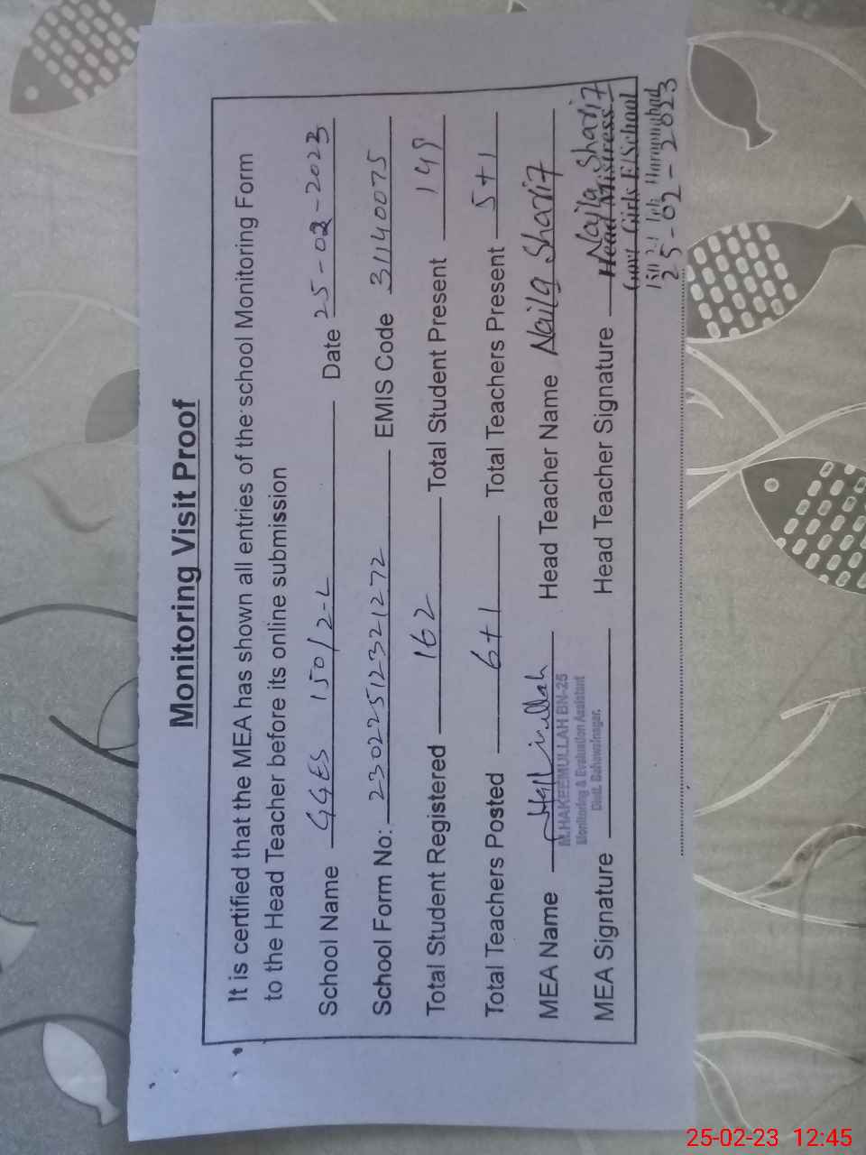 | Attendance Register | Head Teacher | MEA with School | Visit Proof |