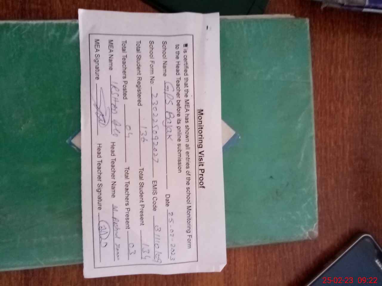 | Attendance Register | Head Teacher | MEA with School | Visit Proof |