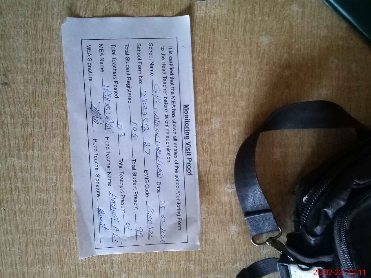 | Attendance Register | Head Teacher | MEA with School | Visit Proof |