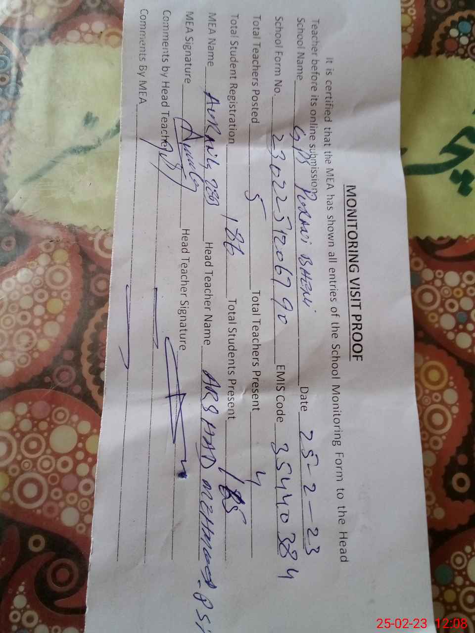 | Attendance Register | Head Teacher | MEA with School | Visit Proof |