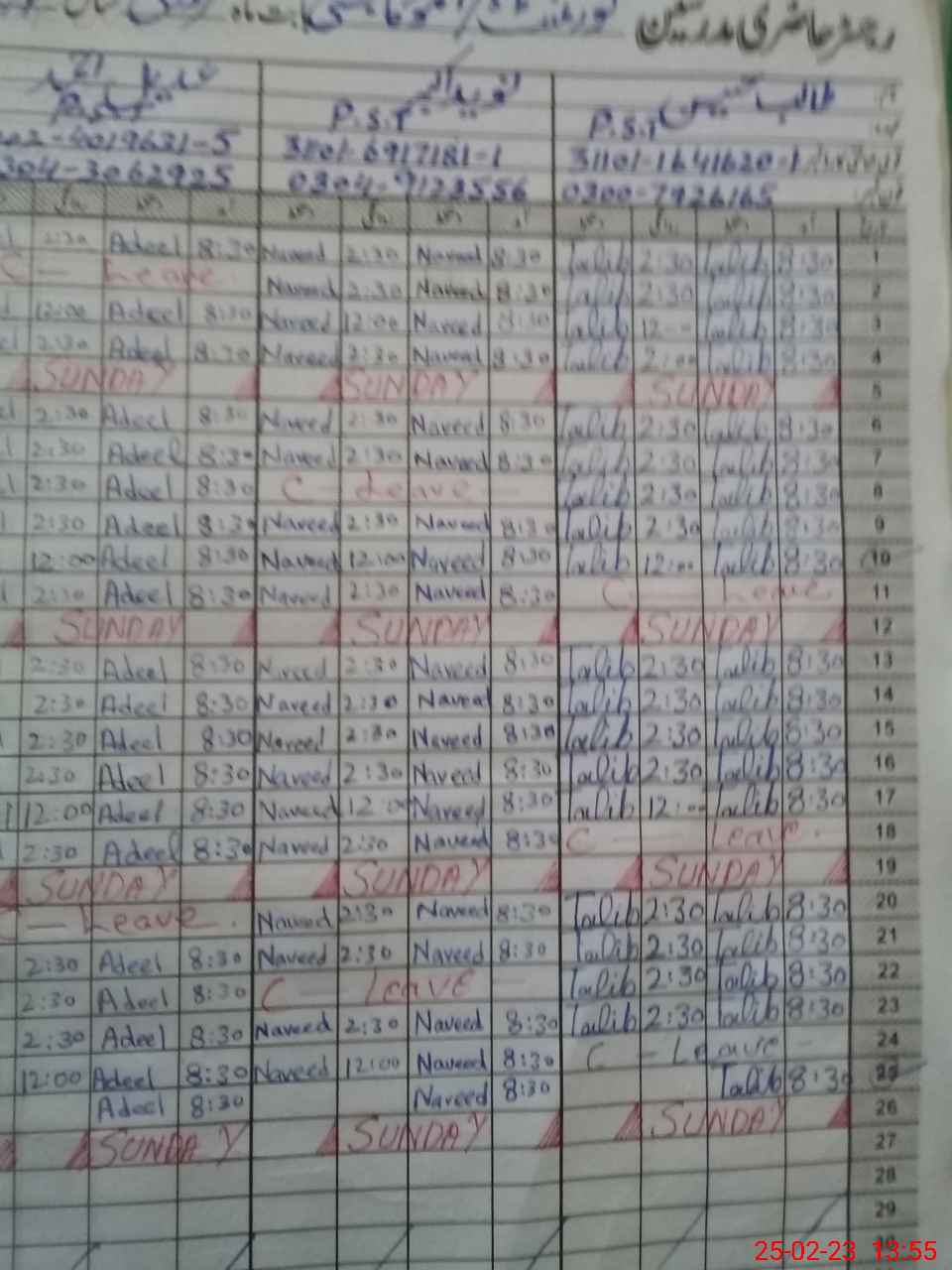 | CNIC | Full Name | Designation | R/C | Absence During Last Calender Month |