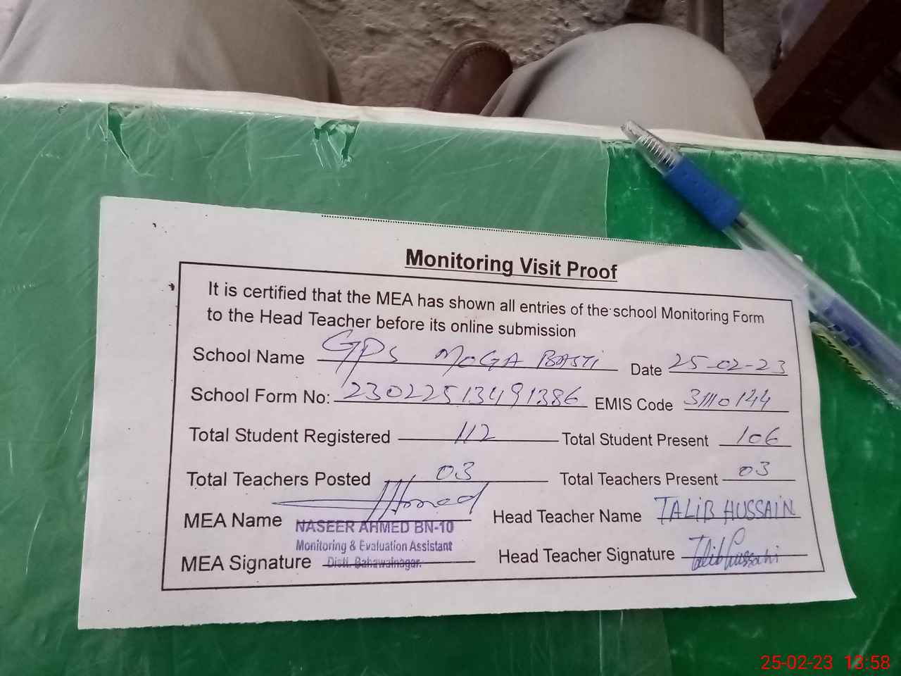 | Attendance Register | Head Teacher | MEA with School | Visit Proof |