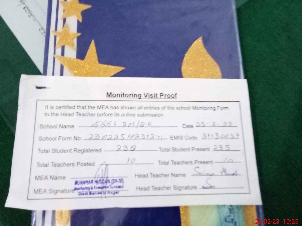 | Certified that this School was Inspected by the Undersigned MEA/DMO Today and the Information Stated Above is as Per Record. | |||||