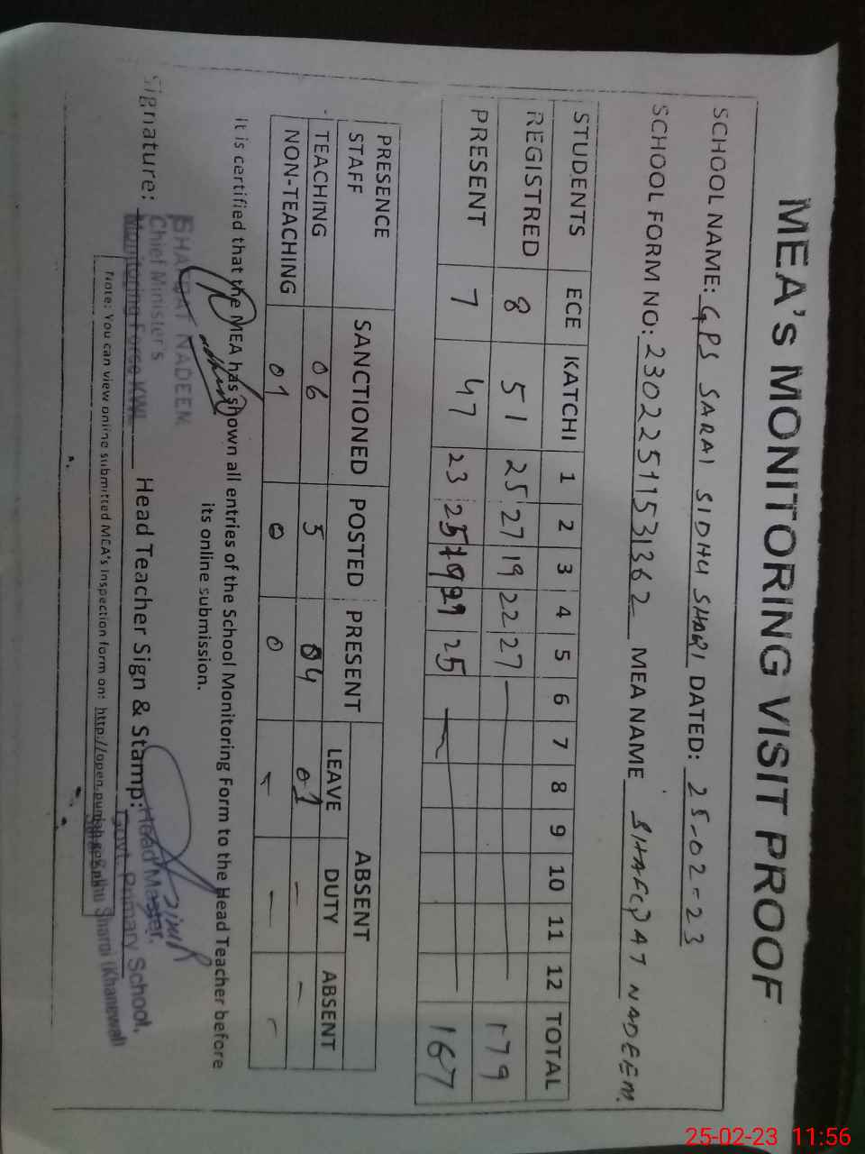 | Attendance Register | Head Teacher | MEA with School | Visit Proof |