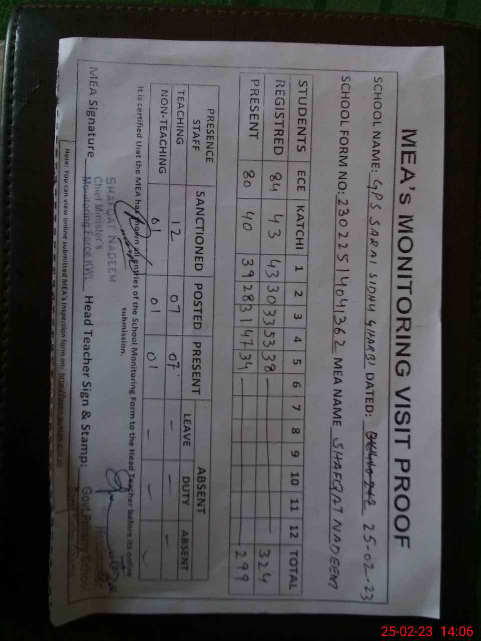 | Attendance Register | Head Teacher | MEA with School | Visit Proof |