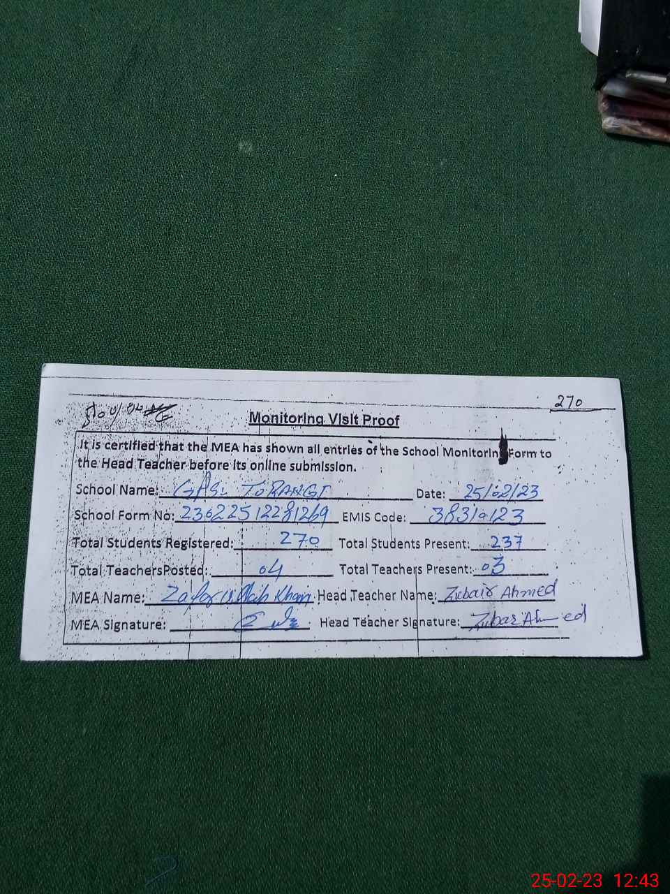 | Attendance Register | Head Teacher | MEA with School | Visit Proof |