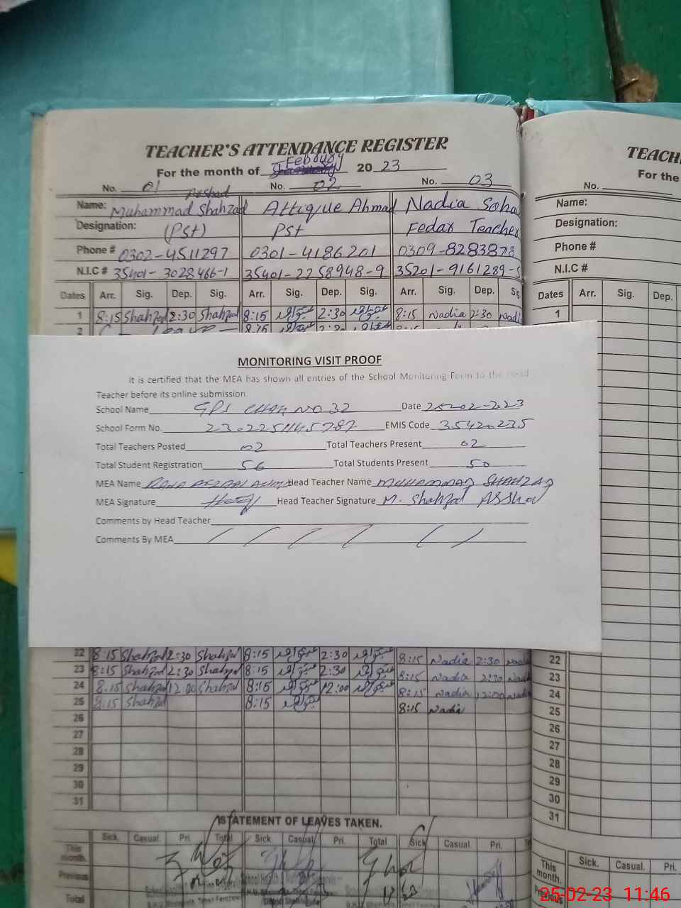 | Attendance Register | Head Teacher | MEA with School | Visit Proof |