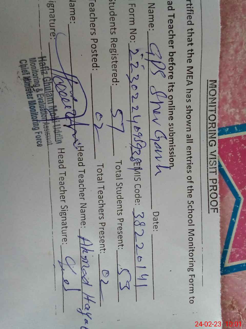 | EMIS Code: 38220141 | Name of School: GPS SHER GARH | |||
