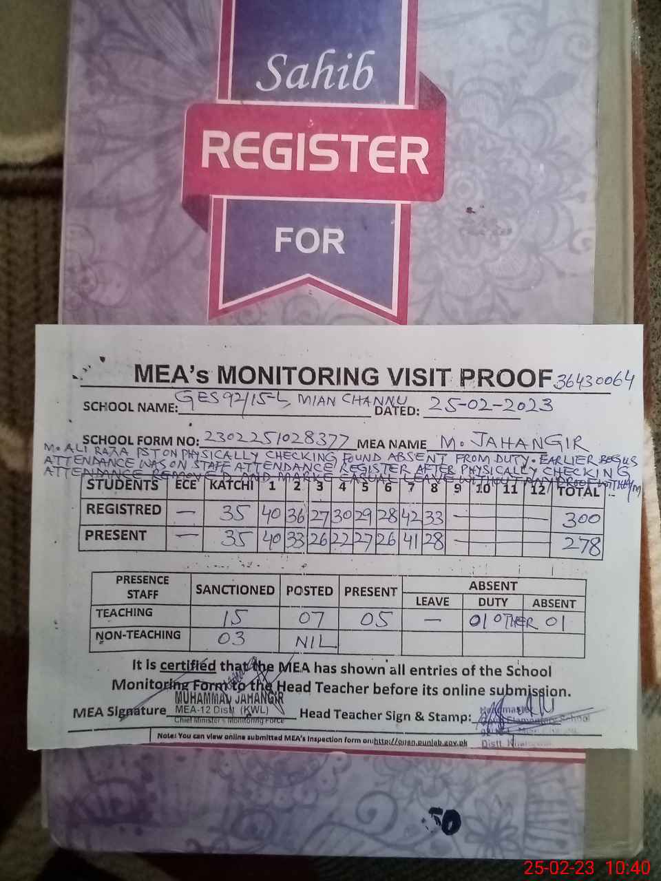 | Remarks (Use Separate Page if Required): M ALI RAZA PST ON PHYSICALLY CHECKING FOUND ABSENT FROM DUTY EARLIER BOGUS ATTENDANCE OF SAID TEACHER WAS ON STAFF ATTENDANCE REGISTER AFTER PHYSICALLY CHECKING THE SCHOOL ATTENDANCE REMOVED AND MARKED C LEAVE ON STAFF ATTENDANCE REGISTER WITHOUT ANY PROOF WITH HM NSB GRANTS AND FTF RECORDS ARE NOT MAINTAINED LESSON PLANS ARE NOT AVAILABLE RANDOM CLASS 6TH IS NOW IN CLASS 7TH | |||||