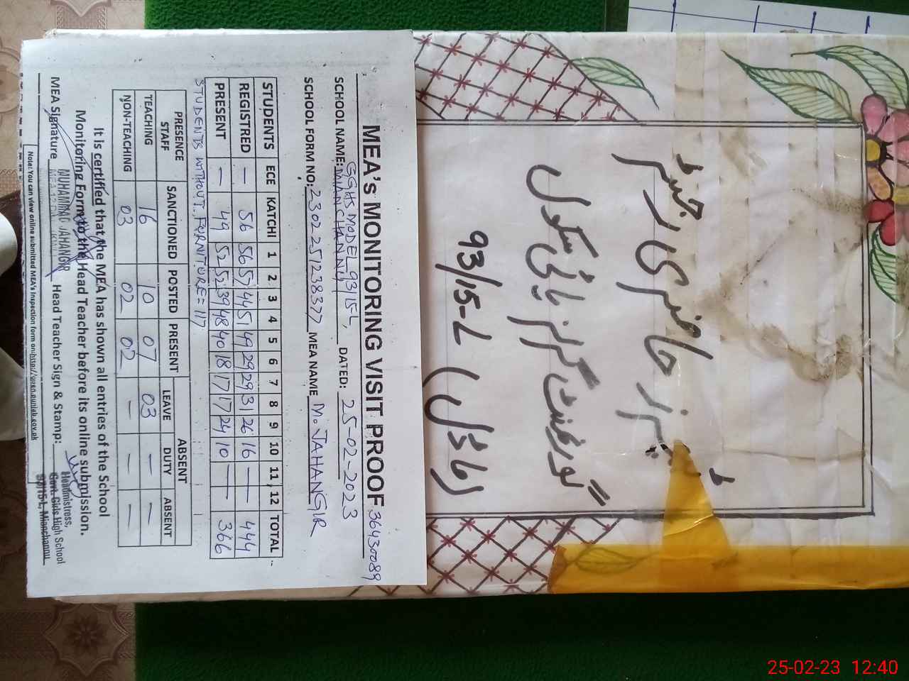 | Certified that this School was Inspected by the Undersigned MEA/DMO Today and the Information Stated Above is as Per Record. | |||||