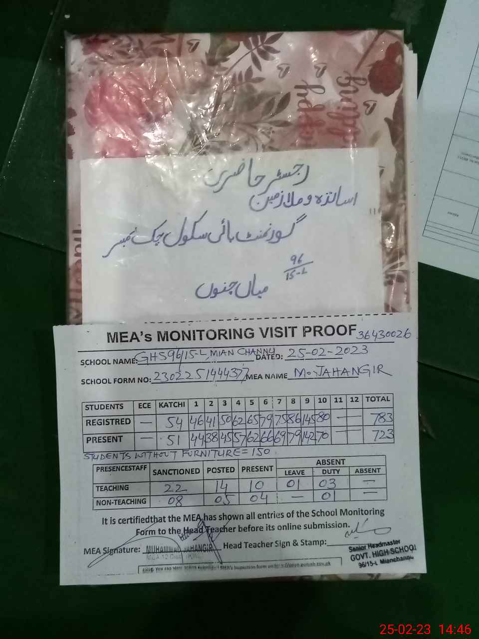 | Certified that this School was Inspected by the Undersigned MEA/DMO Today and the Information Stated Above is as Per Record. | |||||