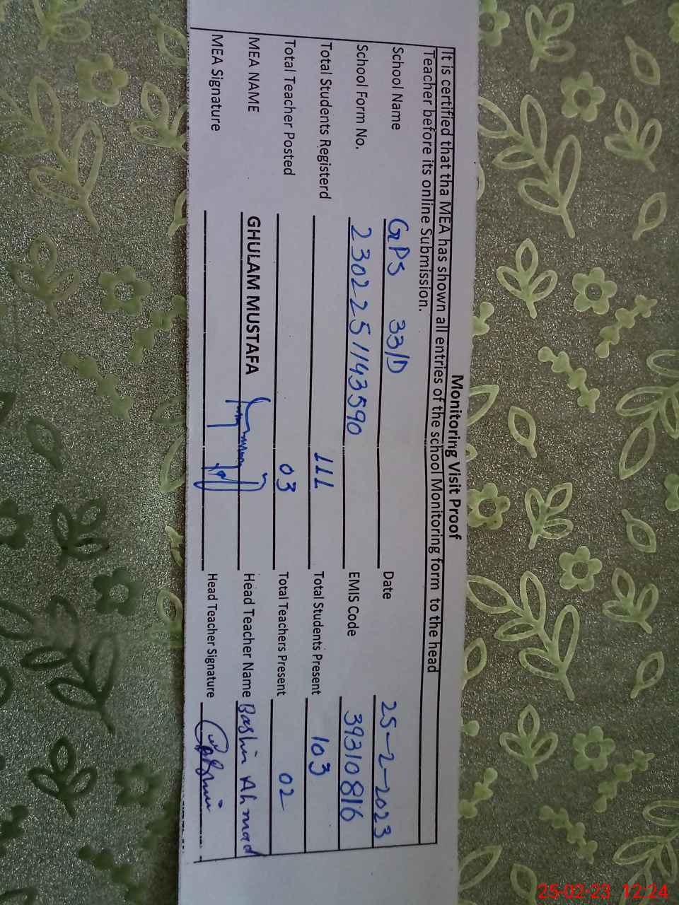 | Name: BA**** AH**** Designation: (School Headmaster's/Headmistress's) PTC/JV Phone/Cell Number: 03**** |