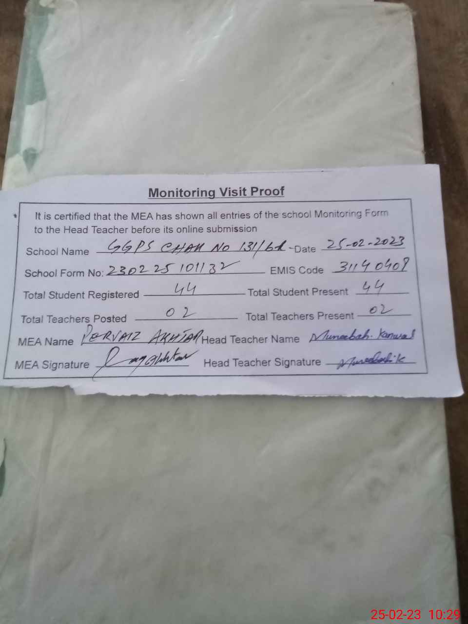 | Attendance Register | Head Teacher | MEA with School | Visit Proof |