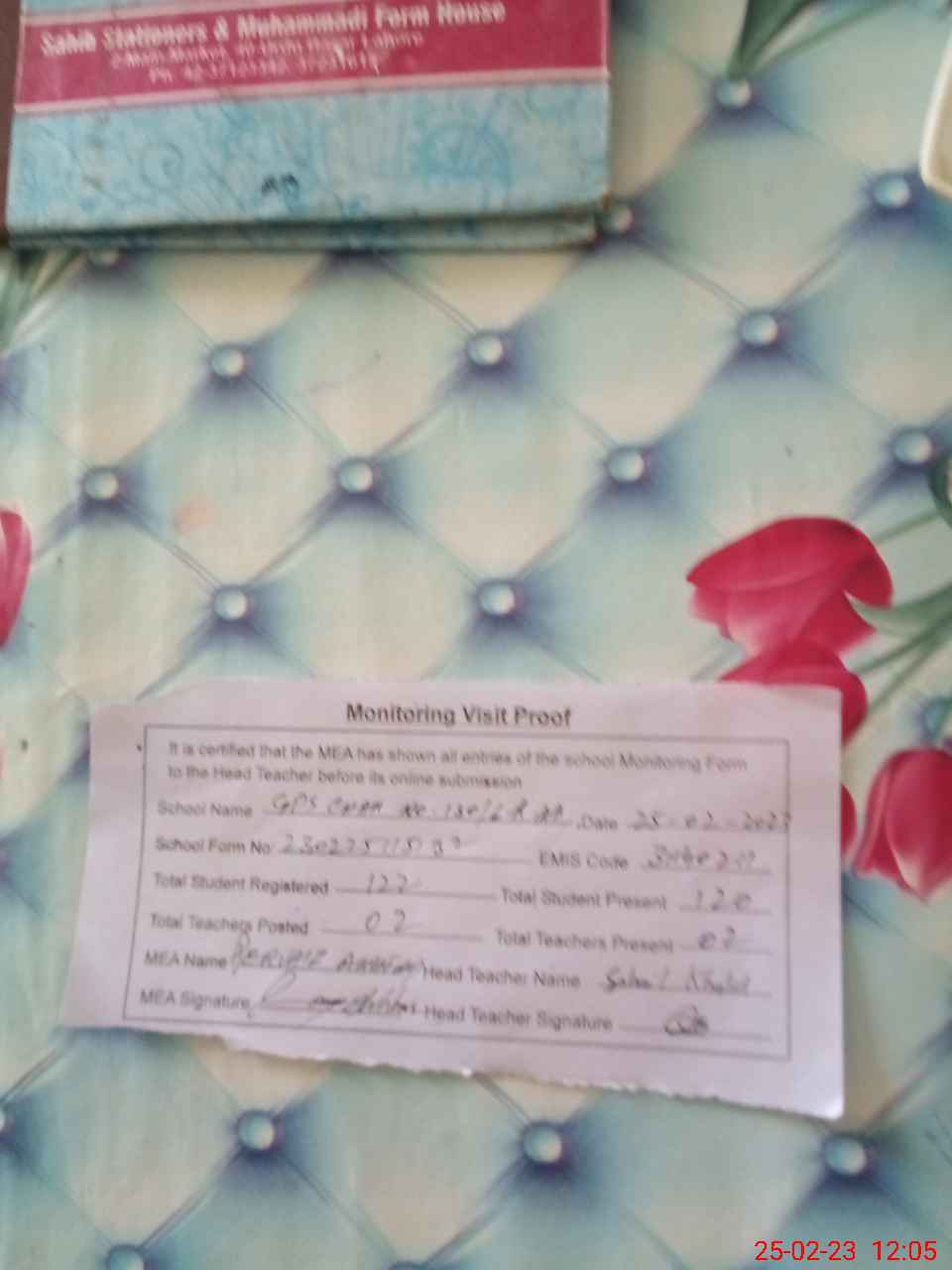 | Attendance Register | Head Teacher | MEA with School | Visit Proof |