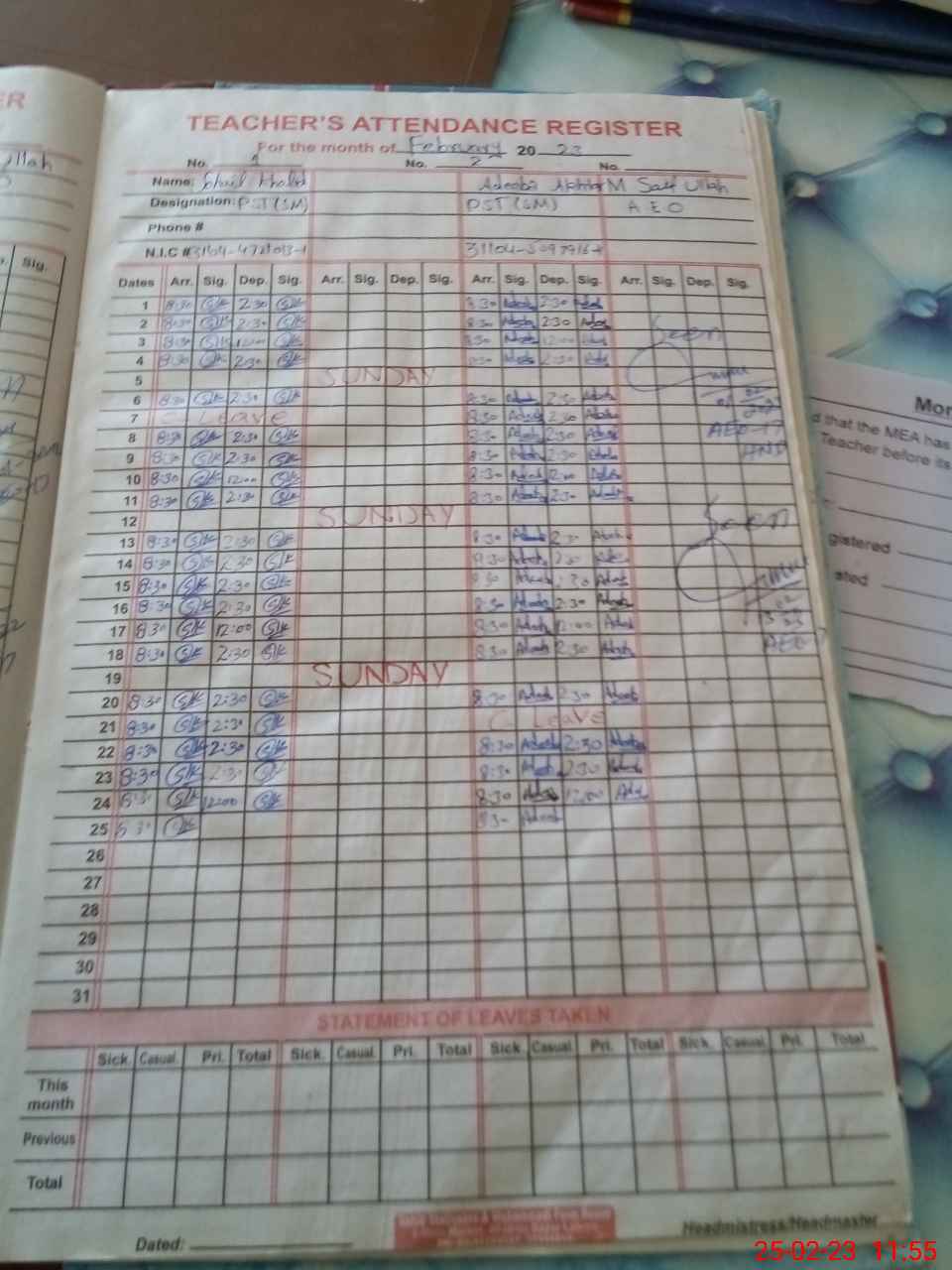 | CNIC | Full Name | Designation | R/C | Absence During Last Calender Month |