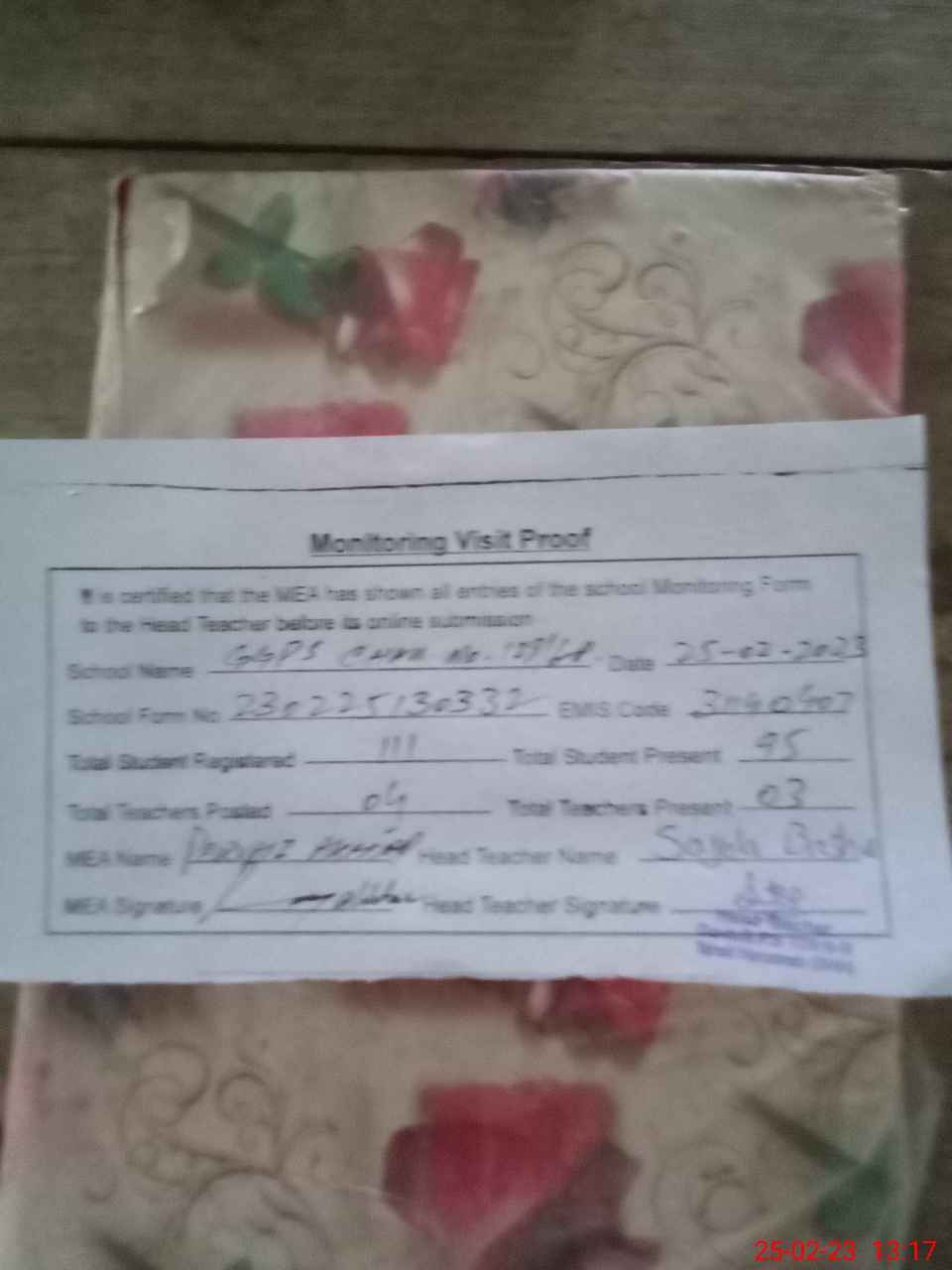 | Attendance Register | Head Teacher | MEA with School | Visit Proof |