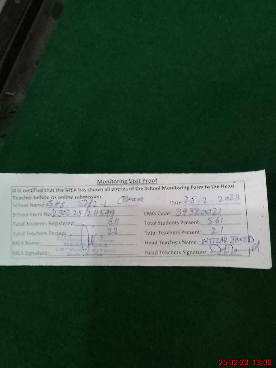 | Attendance Register | Head Teacher | MEA with School | Visit Proof |