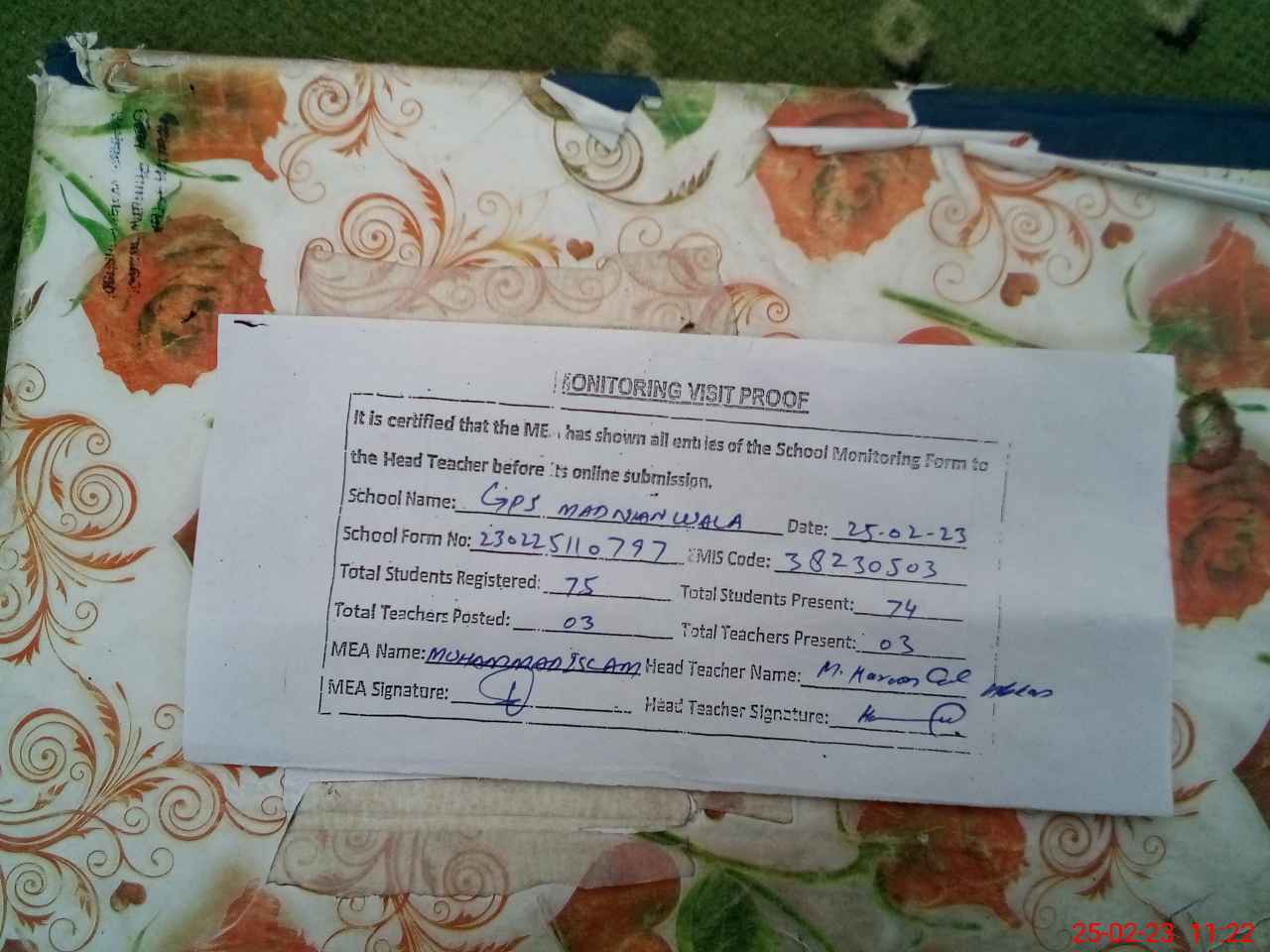 | Attendance Register | Head Teacher | MEA with School | Visit Proof |