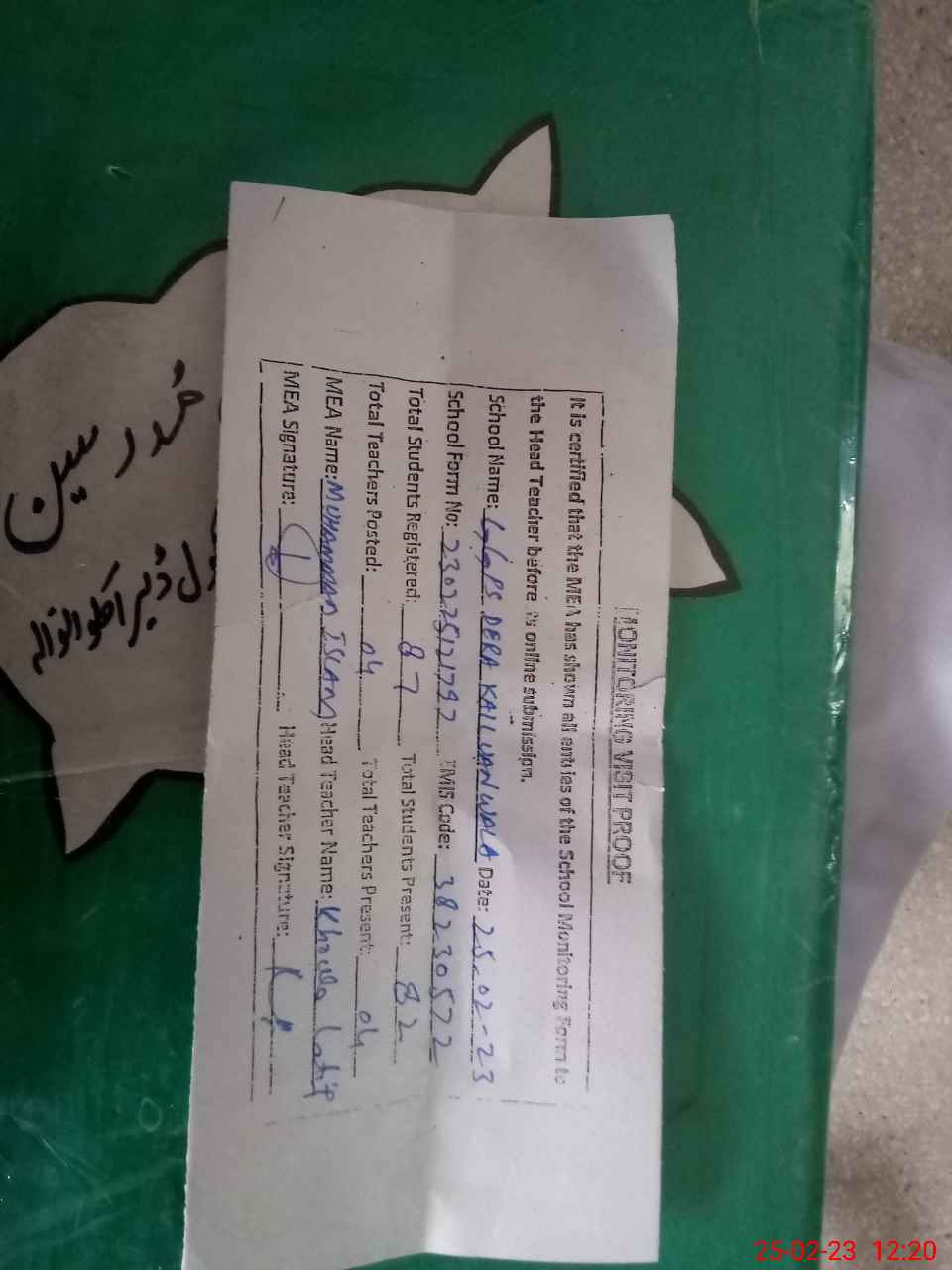 | Attendance Register | Head Teacher | MEA with School | Visit Proof |