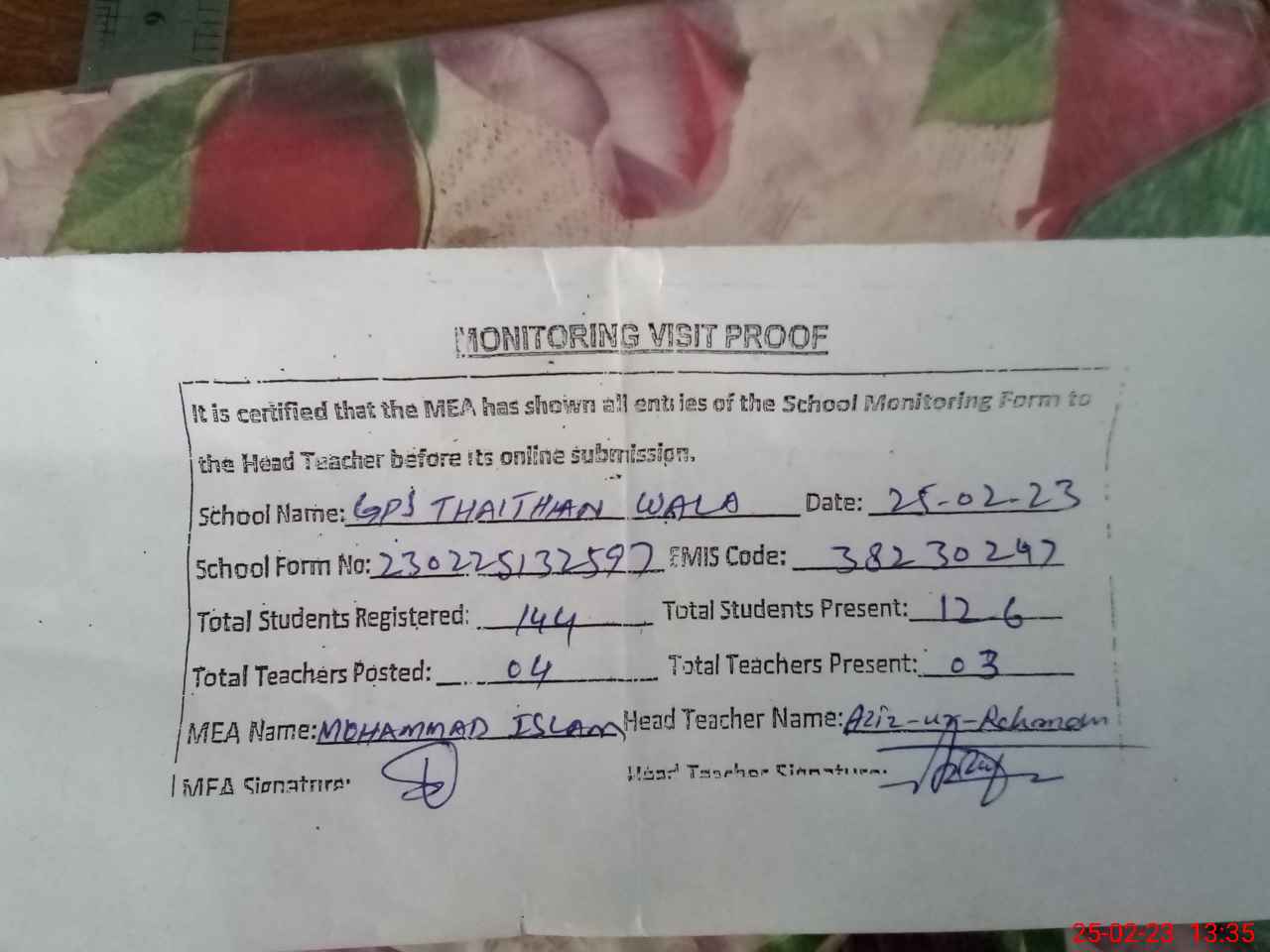 | EMIS Code: 38230247 | Name of School: GPS THAITHIAN WALA | |||