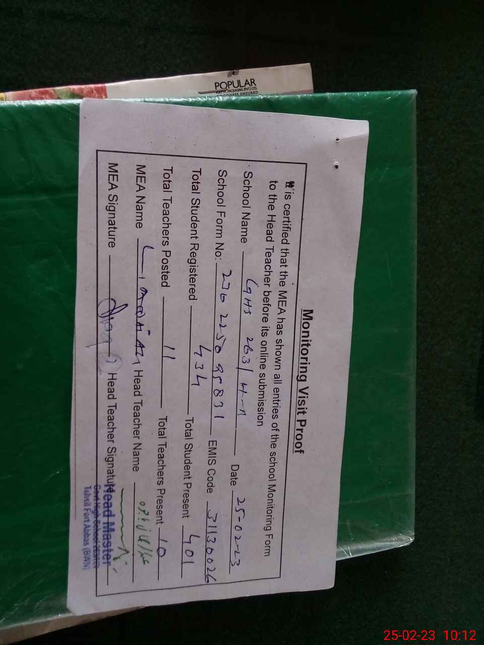 | Attendance Register | Head Teacher | MEA with School | Visit Proof |
