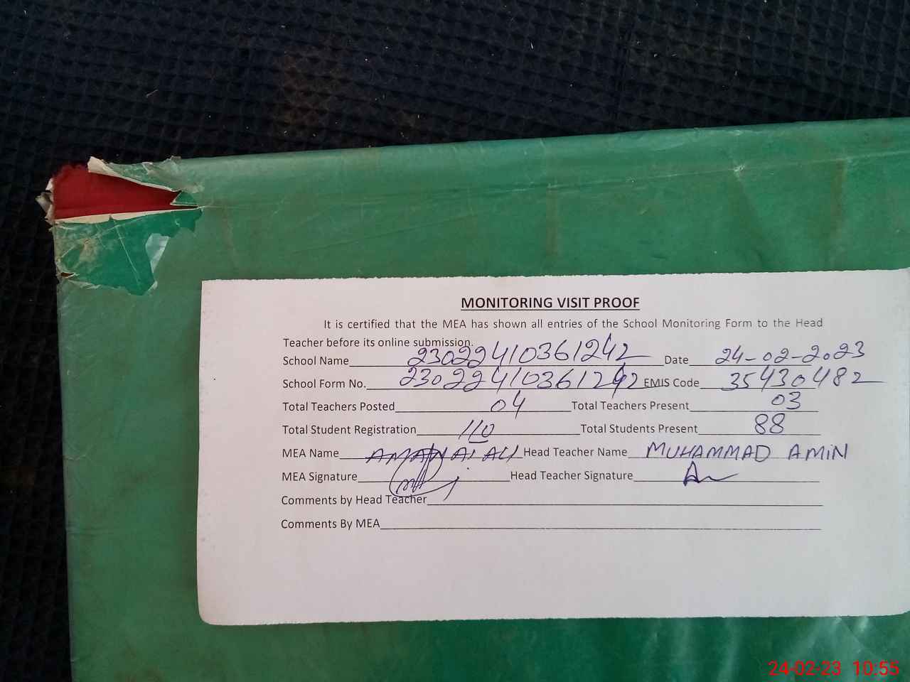 | Attendance Register | Head Teacher | MEA with School | Visit Proof |